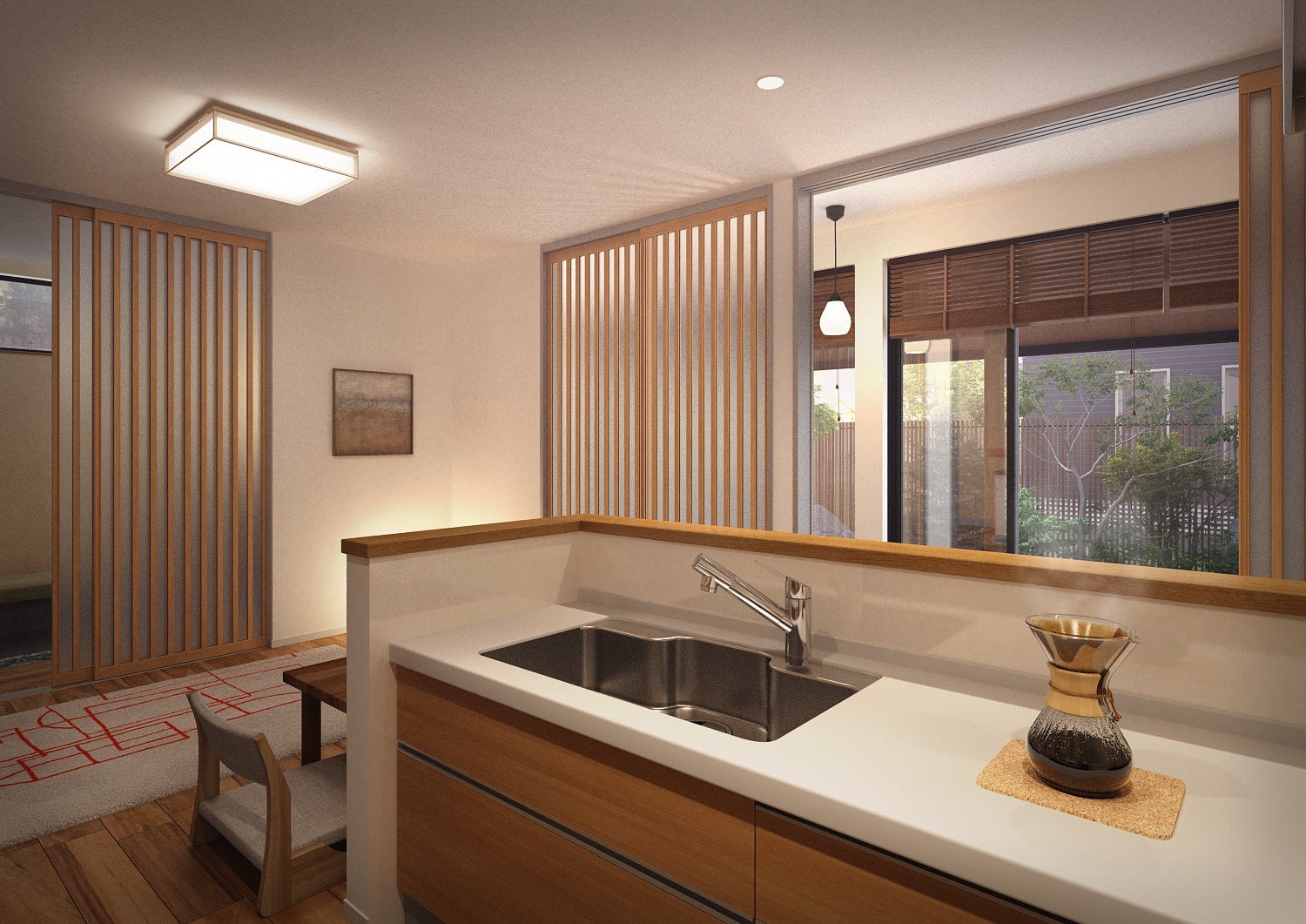 現代のリビングにあたる「いたのま」は中央に「だいどころ」を設ける事でどこにいても繋がりを感じられる暖かい空間にしました。これにより、家事などの導線もスムーズです。台所の奥には大容量の収納スペースも設けています。