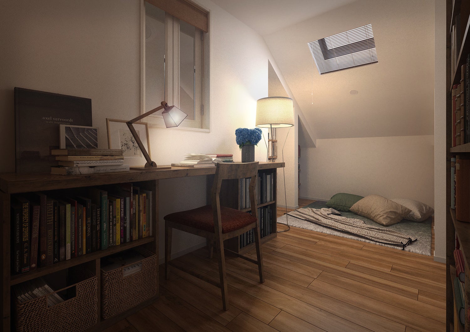 収納スペースとしての活用や、ほっと一息つきたいときの自分だけの時間を確保するには最適な空間です。ソファーを置いてゆったりと読書も楽しめます。 お子様は、探検気分で想像力も掻き立てられるでしょう。
