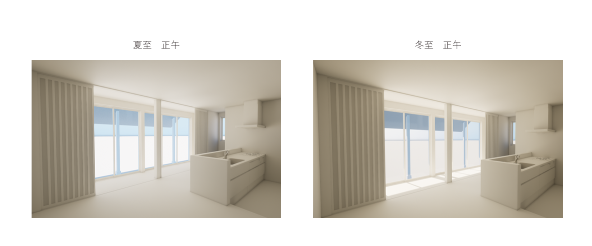 自然を取り込む大開口の先には室内の明るさや温かさを調整する深い軒日光を操る大屋根があります。その深い軒のおかげで、太陽が低い位置に来る寒い冬は日光を上手に取り込み、太陽が高い位置に来る暑い夏は上手に日光を遮り過ごしやすい室内を作ります。