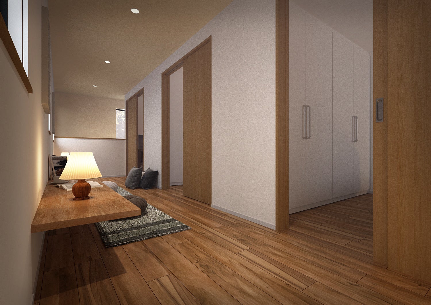 階段を上がると、そこには廊下兼広間があります。テーブルや棚を置いて思い思いに過ごし、家族の団欒も楽しめるスペースです。