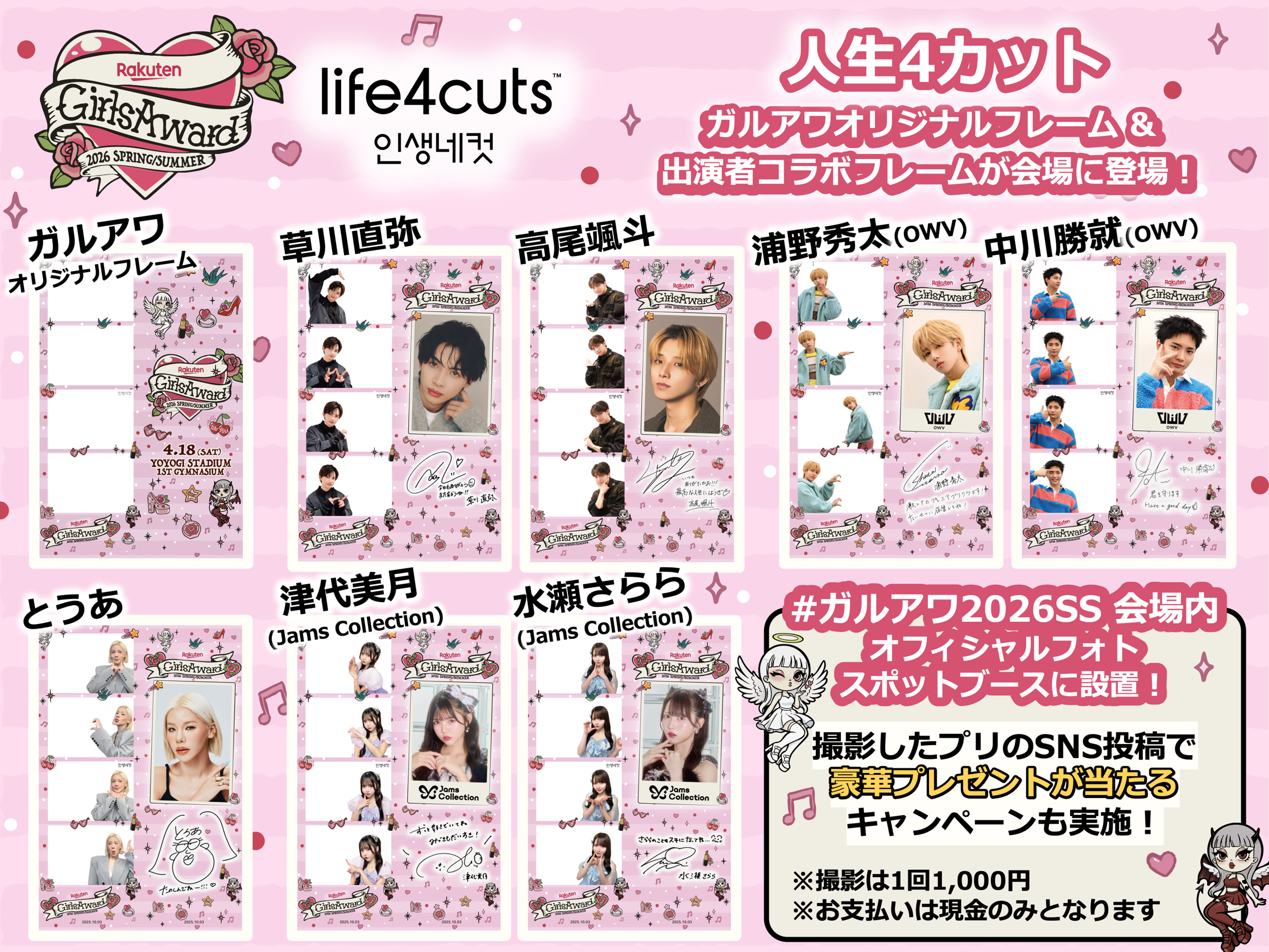 韓国プリ「人生4カット」では、今回のキービジュアルを使ったオリジナルフレームで撮影できるほか、草川直弥さん、高尾颯斗さん、OWVの浦野秀太さん、中川勝就さん、とうあさん、Jams Collectionの津代美月さん、水瀬さららさんのガルアワ限定コラボフレームでの撮影も可能です。