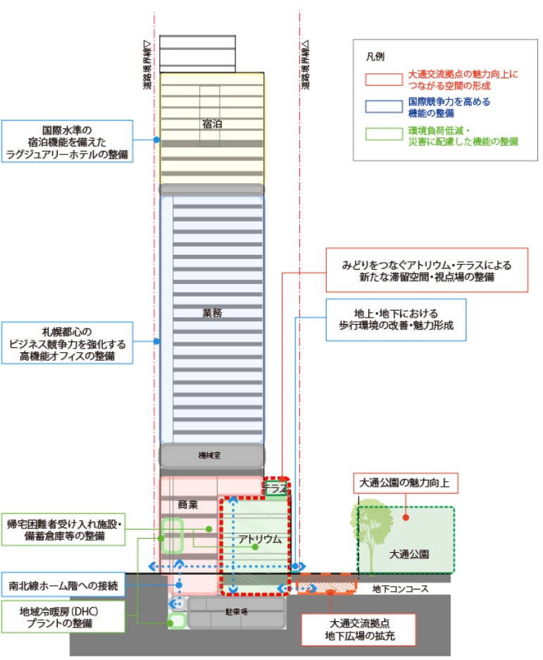 本事業では、商業・業務・交流機能の充実、国際水準の宿泊機能としてのラグジュアリーホテル導入、重層的な歩行者空間の整備、大通以南初のエネルギーセンターの整備や環境配慮、防災機能の強化等を行うことにより、札幌都心の価値向上に寄与し、持続可能で魅力ある札幌都心をけん引する拠点の形成を目指してまいります。