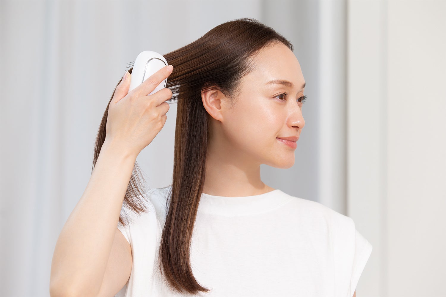 朝は、睡眠中の摩擦などでダメージを受けがちな髪をブラッシングでケア。マイナスイオンと音波振動で髪をしなやかにしながら、寝起きもすっきり。