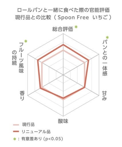 「Spoon Free」は、「忙しい朝に洗い物が減って助かる」「子どもを抱っこしながら片手で使える」「子どもが自分で使えてありがたい」など子育て世代から高い支持を得ています。今回はパンを焼かずに食べる頻度が高い、子育て世代やシングル世帯に向けて、トーストしていないパンにより合う仕立てにリニューアルしました。フルーツのブレンドを見直し、甘みと酸味のバランスを調整することで、小麦の自然な甘さやバターとの一体感が向上しました。使いやすさとおいしさに磨きをかけ、忙しい子育て世代に加えてシングル世帯からも支持される商品を目指します。