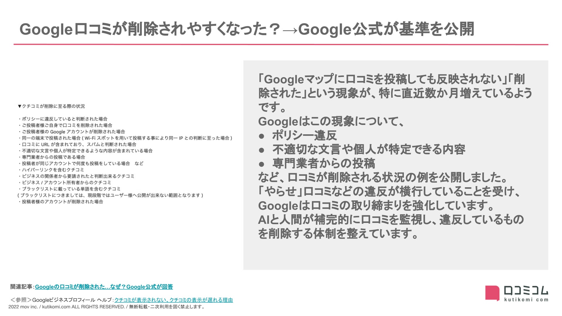 - Googleが相次ぐ口コミ削除の報告について、削除の基準などを回答