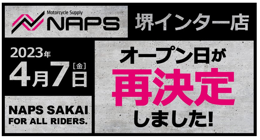 オートバイ用品の小売・開発を行う株式会社ナップス(本社:神奈川県横浜市、代表取締役:望月 真裕)は、諸事情によりオープンの延期を発表いたしておりましたオートバイ用品店「ナップス堺インター店」(所在地:大阪府堺市南区宮山台3丁1-15)を 2023年4月7日(金)にあらためてオープンすることをお知らせいたします。この度は当初発表いたしましたオープン予定日を延期する運びとなり、お客様、お取引先様各位にご迷惑とご心配をおかけしましたことを心よりお詫び申し上げます。