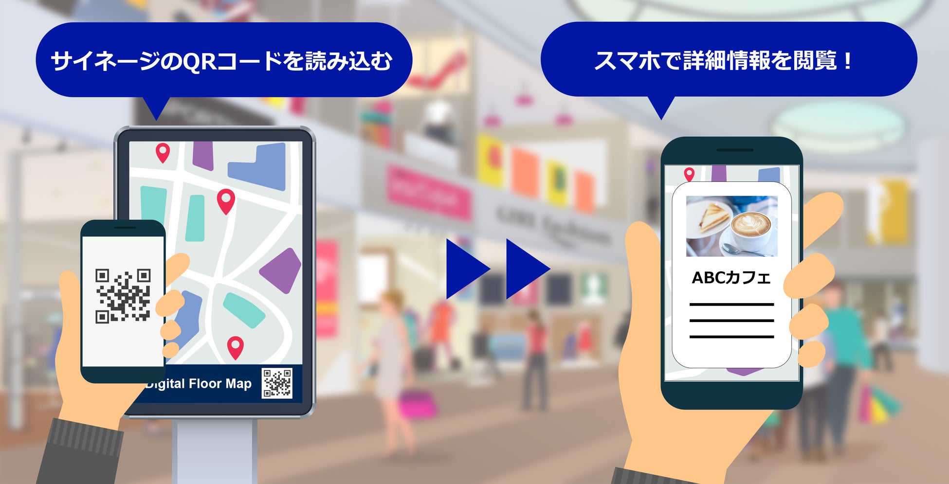 2023年10月に伊勢丹新宿店で検証を行った「Will-Signコンテンツパッケージ」のデジタルサイネージとスマートフォンの連携機能を商用化。デジタルサイネージにQRコードを表示させ、スマートフォンで閲覧できるデジタルフロアマップに誘導することで、お客様の目的地内での効率的な移動や、従業員の案内業務の負担削減に貢献します。
