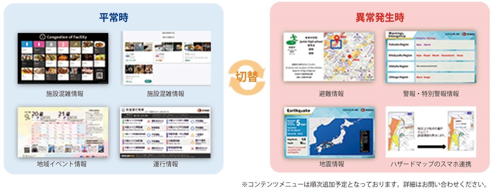 平常時と異常発生時とで配信コンテンツを出し分けることが可能。通常は施設案内情報やフロアマップなどに利用いただき、災害などの異常が発生した場合は避難情報や警報情報などの緊急情報の配信へタイムリーに切り替えられます。