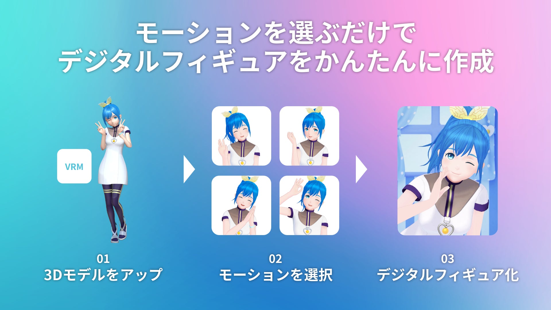 デジタルフィギュアの作成は、3Dモデル(VRM形式)をアップしてモーションや背景を選ぶだけ。50種類以上あるモーションの中から、キャラクターに合ったものを選ぶだけで魅力的なデジタルフィギュアを作成できます。(もっとこだわる方向けのこだわりプランもご用意)