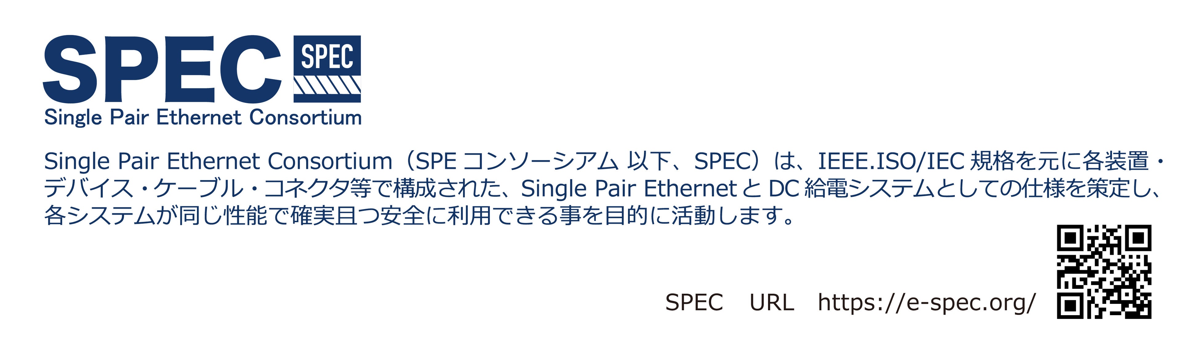 SPECが普及を推進する「Single Pair Ethernet(以下「SPE」)」は、4対ケーブルを使用する既存システムと異なり、1対ケーブルを使用するため、省資源化につながる新しい技術です。また、直流給電システムによる省エネルギー化を実現するとともに、多様な電源システムとの連携も可能です。 SPECは、環境性能に優れたSPEを、スマートシステムの基盤技術として街や工場、ビルや住宅等のシーンで利用可能にし、持続可能な世界の実現に貢献することを目指しています。