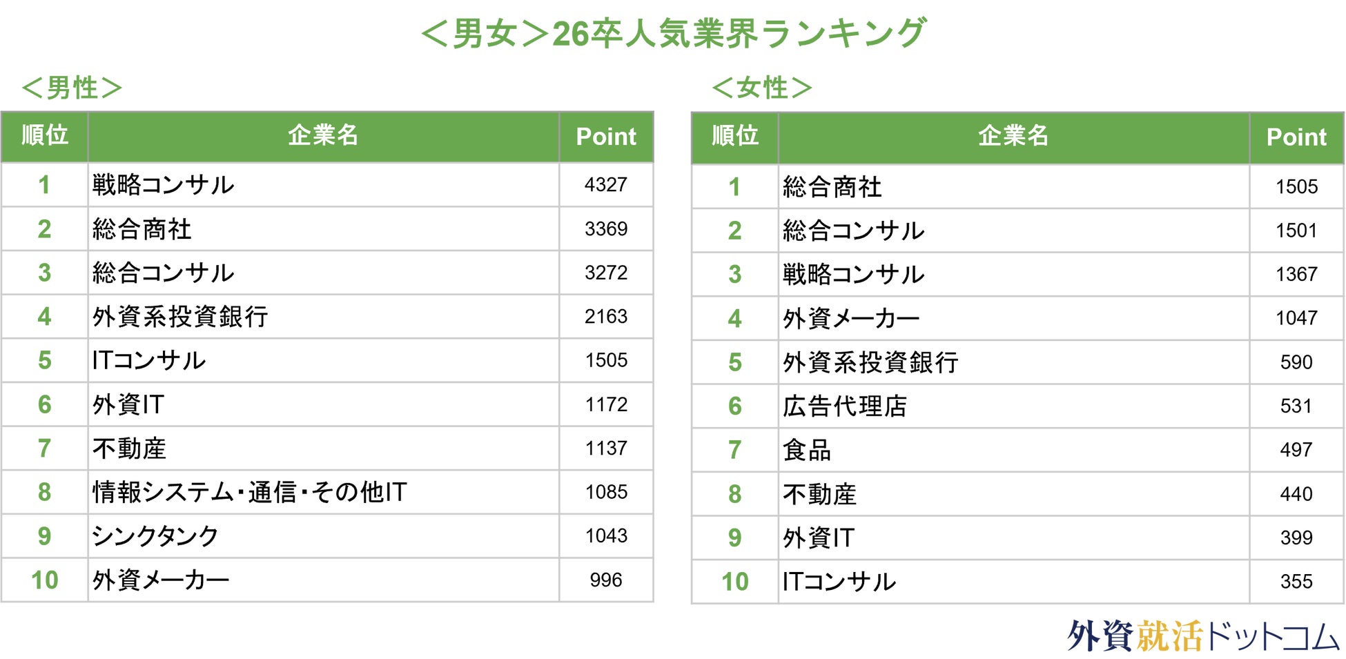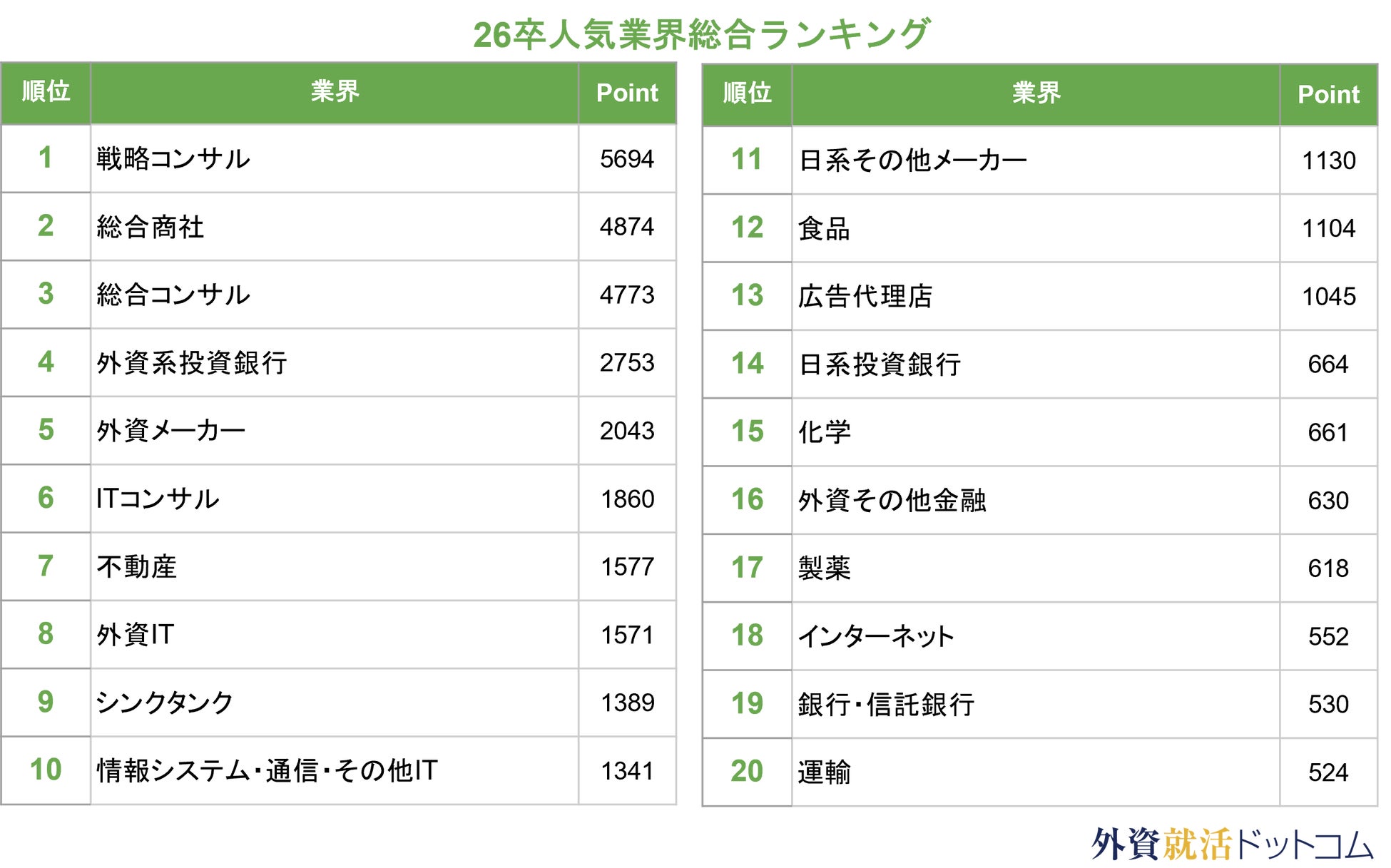 外資就活ドットコムの会員情報より抽出。企業ランキング・業界ランキングは会員情報に登録している3つの志望企業・志望業界を、1位:3ポイント、2位:2ポイント、3位:1ポイントとして集計。ポイントによってランキングを作成。