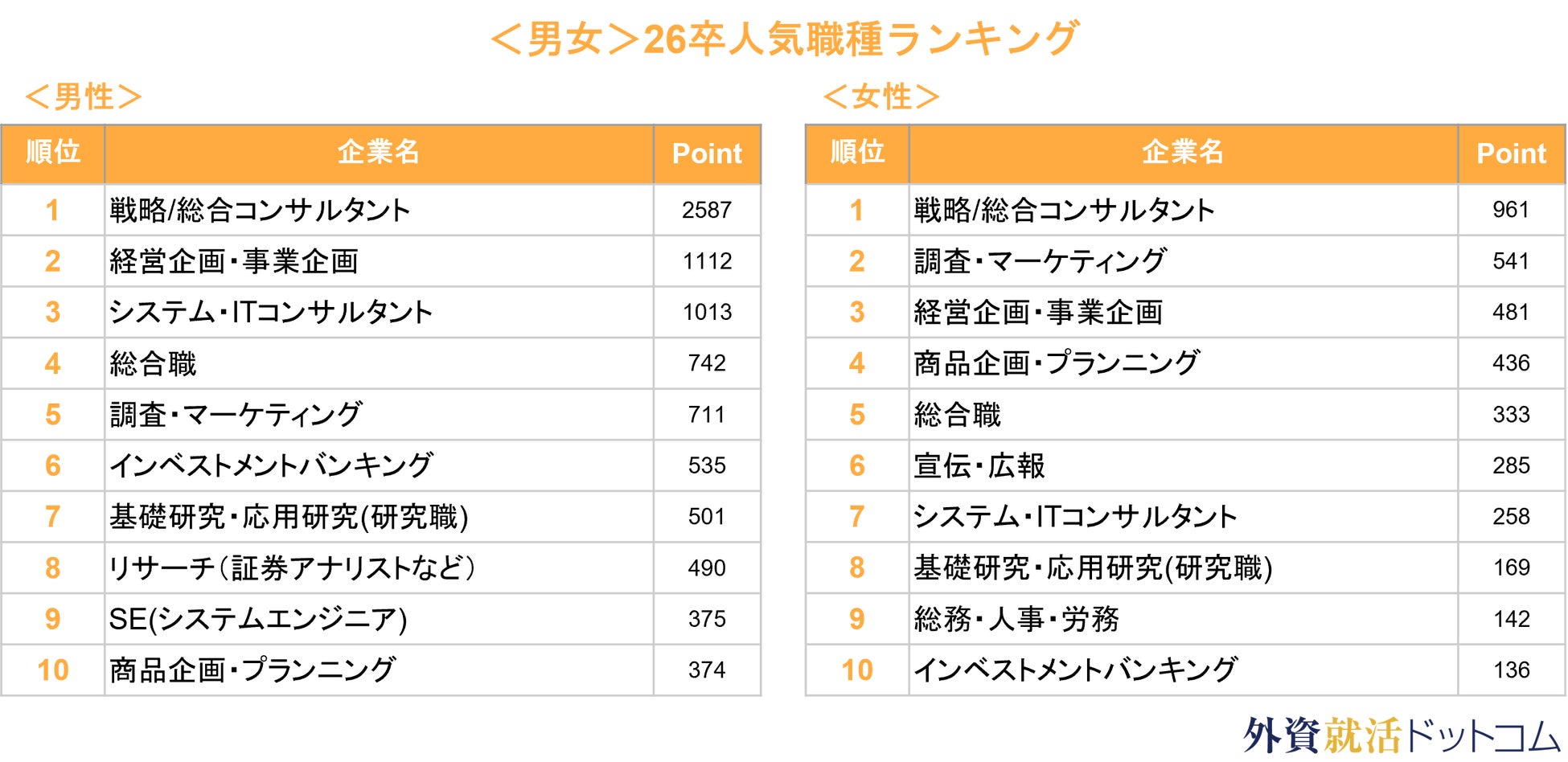 戦略コンサルが人気だが、女性は商社、総合コンサル志向