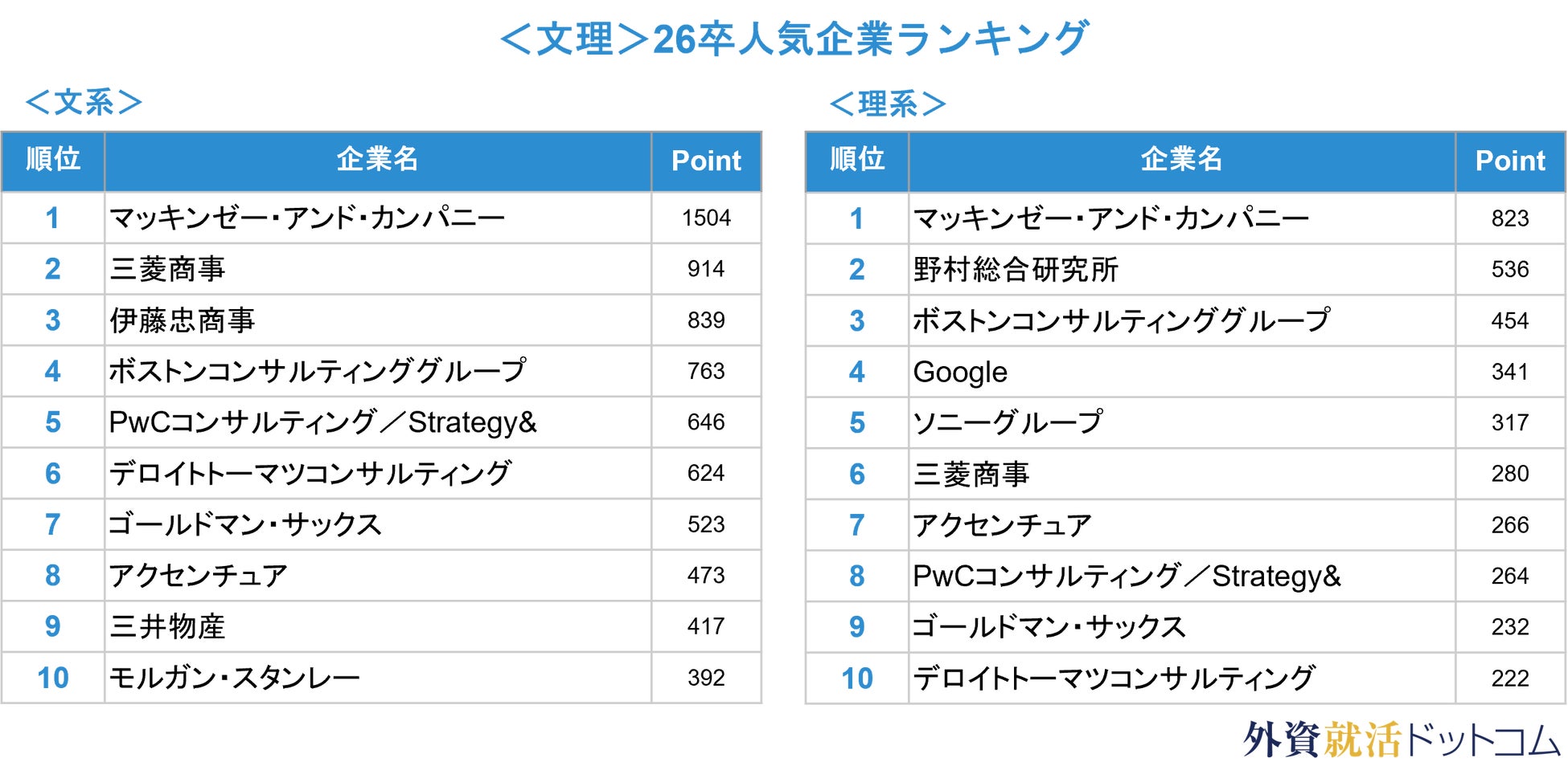 1位のマッキンゼー・アンド・カンパニーは2位と倍近くのポイントを獲得する圧倒的な人気。マッキンゼーは文理・男女の部門別でもすべて1位となっており、上位校生にとって最も憧れられる企業と言える。
