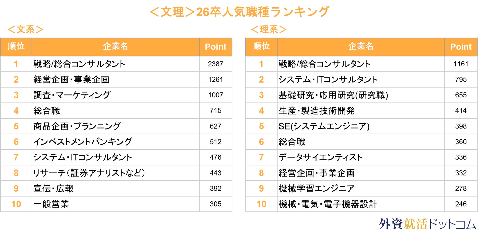 コンサル職を除くと、理系では基礎研究・応用研究(研究職)、生産・製造技術開発、SE(システムエンジニア)が上位にランクイン。対して文系は経営企画・事業企画、調査・マーケティング、総合職が高順位となった。人気業界ランキングでは、文理で比較してもトップ10の顔ぶれはあまり変わらないが、志望職種ははっきりと分かれている。