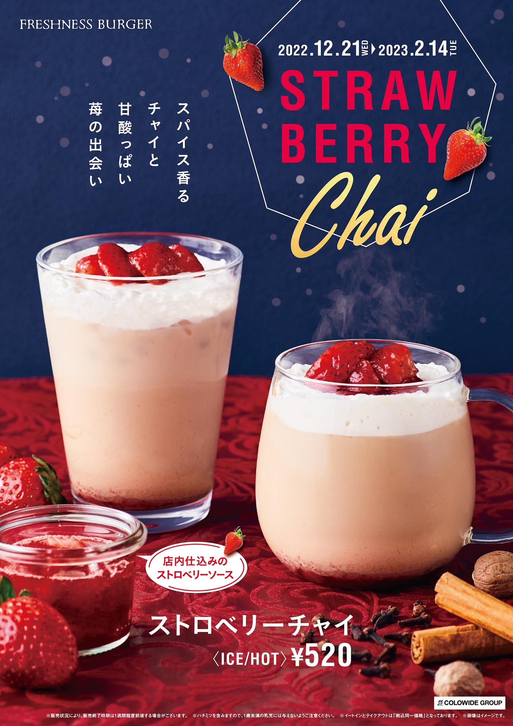 今回、フレッシュネスでもコアファンが多いスパイスを効かせたこだわりの[チャイ]をベースに、『自家製ストロベリーソース』をたっぷりとトッピングしたホリデーシーズンにピッタリの商品をご用意しました。