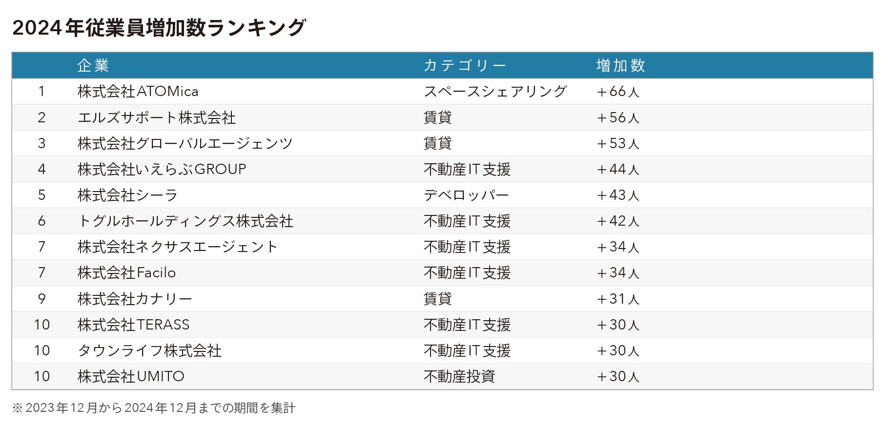 不動産分野スタートアップ 従業員増加数ランキング(2024年)