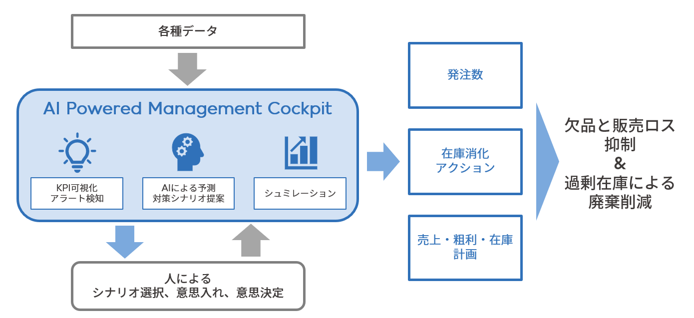 今回、アクセンチュアが提供しているソリューション「AI Powered Management Cockpit」を活用。経営目標や管理指標に対する進捗状況を一覧表示し、未達になる見通しの場合にはアラートを出して、達成に向けた対応策をAIが複数提示します。さらに、それぞれの対応策を講じた場合の効果も併せてシュミレーションされます。1年強にわたるPDCA高度化の試験の結果、欠品による販売ロス(売り逃し)の約65%削減(粗利金額ベース/2019年比)、廃棄ロスの約10%削減(除却・評価損含む/2019年比)が確認されました。