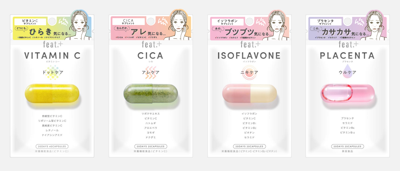 今回発売となる新シリーズ「feat.+」は、明日のキレイをかなえる“飲む下地”のような速攻ケアのサプリメントです。多様化する美容悩みに合わせ、ひらき悩みに向けた『feat.+ VITAMIN C ドットケア』、ゆらぎや荒れ悩みに向けた『feat.+ CICAアレケア』、ブツブツ悩みに向けた『feat.+ ISOFLAVONE ニキケア』、カサカサ悩みに向けた『feat.+ PLACENTA ウルケア』の4種を展開しています。ぜひ、今抱えている美容悩みに寄り添う速攻ケアとしてご活用ください。