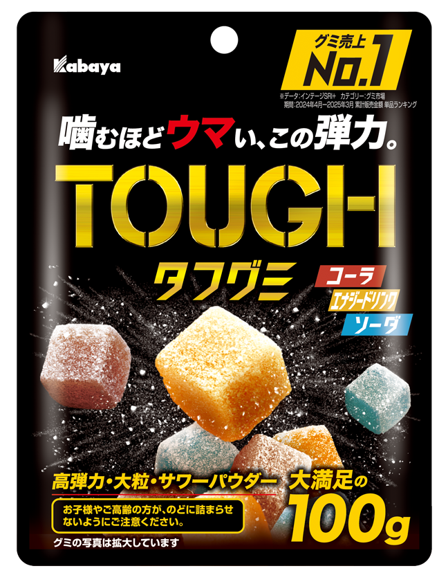 『タフグミ』は、“噛むほどウマい、この弾力。”というコピーが表す通り、「噛みごこちの良い高弾力食感」「大粒」「サワーパウダーの刺激」が生み出す唯一無二の“噛み続けたくなる、やみつきのウマさ”が特長です。