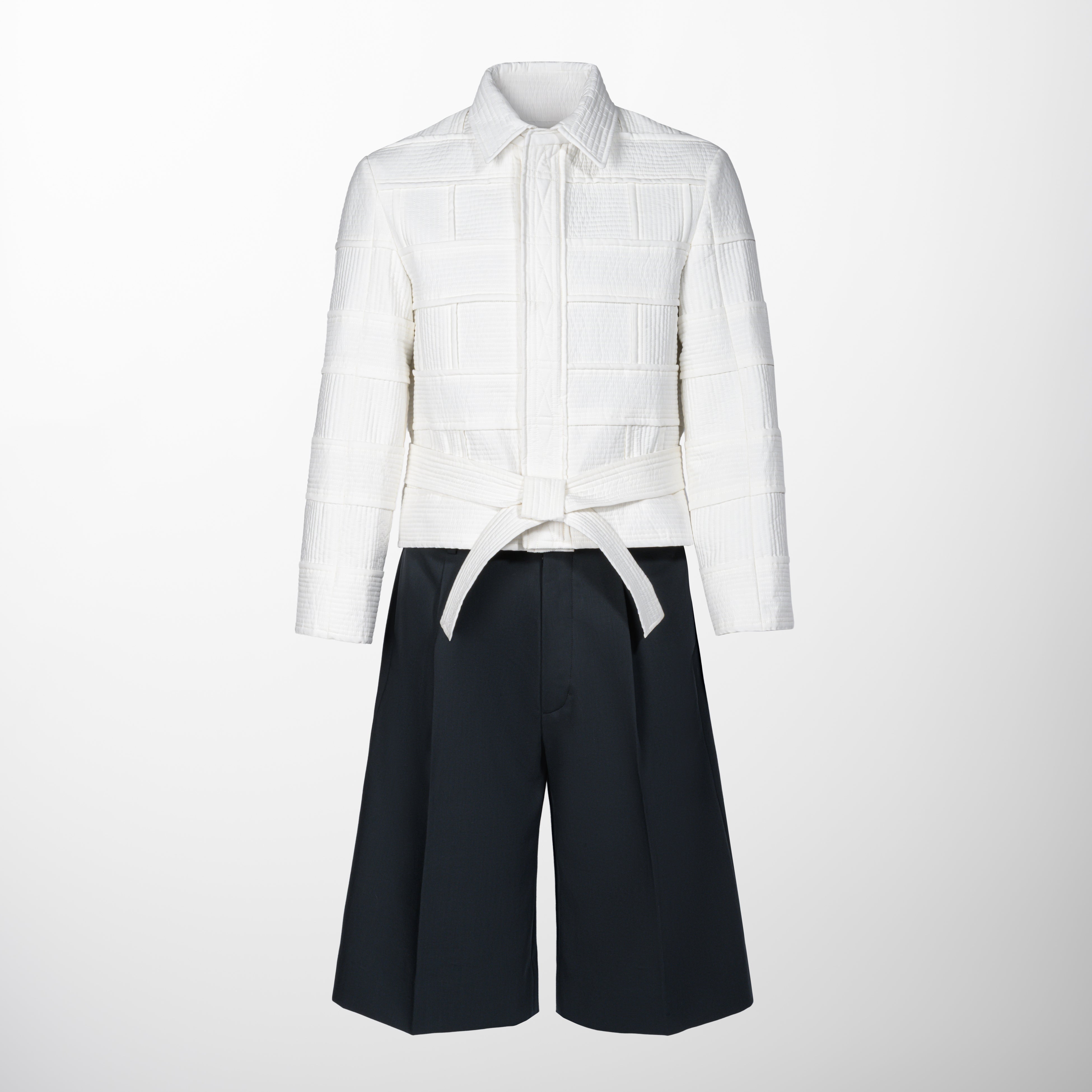 武道の帯を縫い合わせて仕立てた白いボクシージャケット。