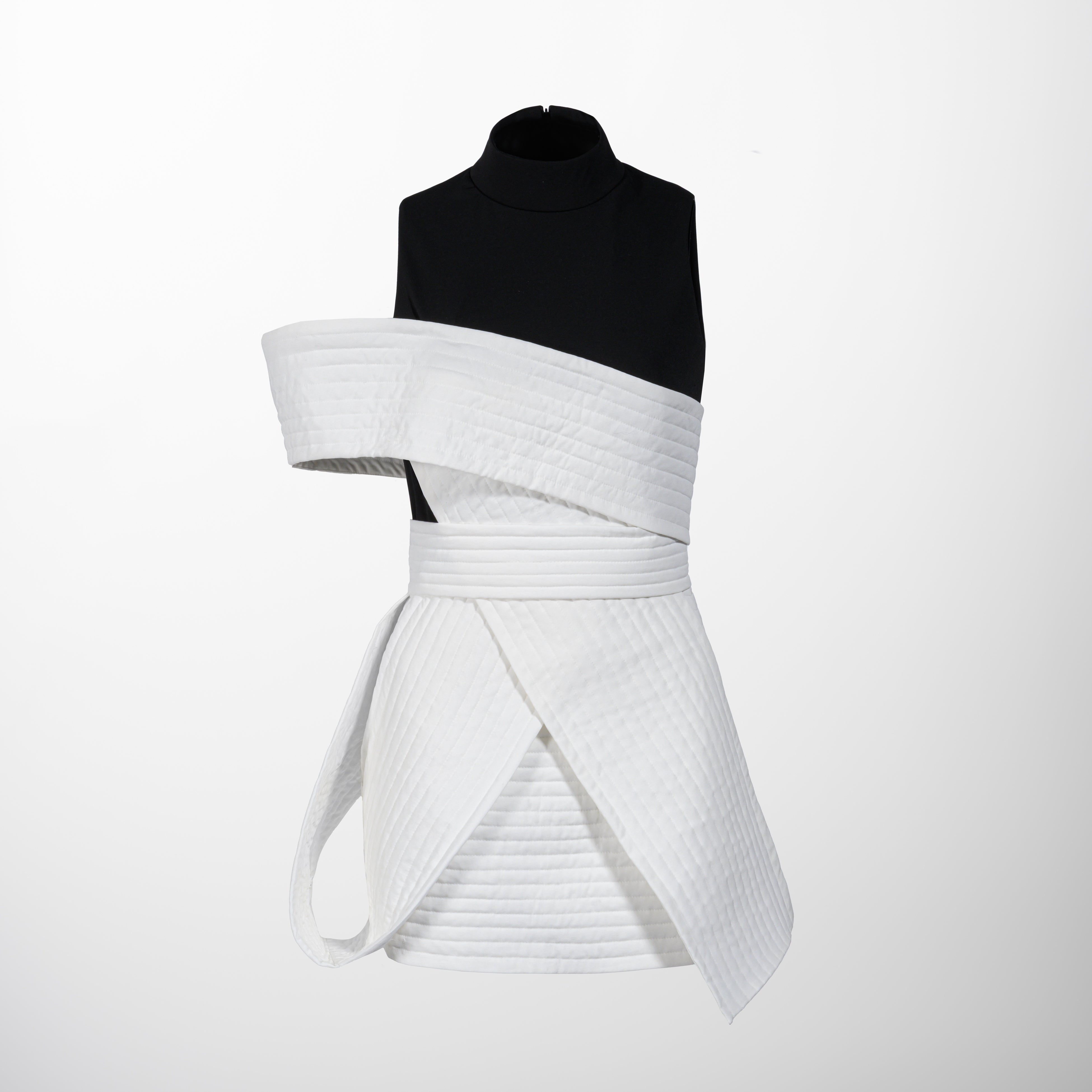 鮮やかなブルーのテコンドーの結びを構造に取り入れたミニドレス。