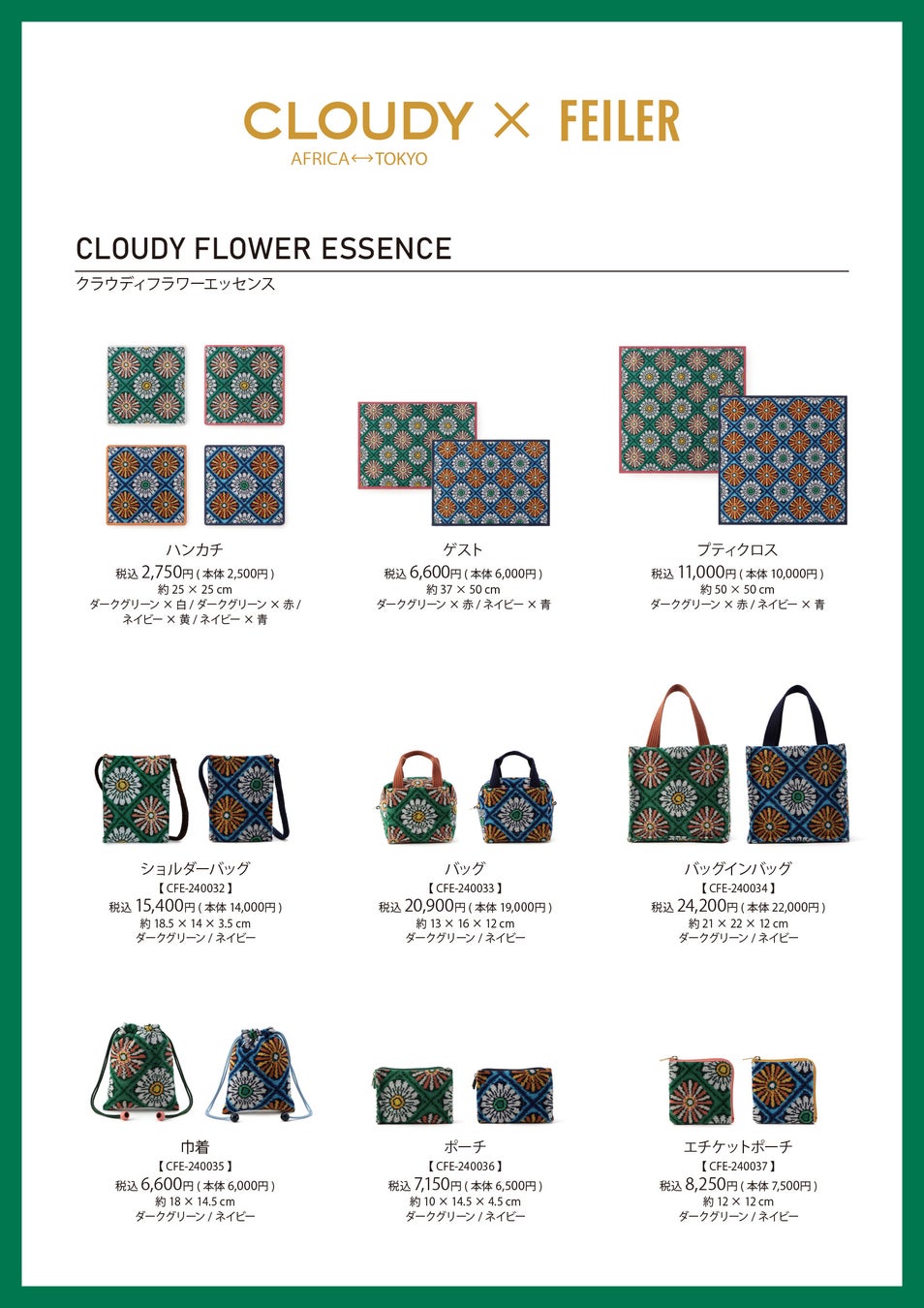 今年で4回目となる2社でのコラボレーション。CLOUDYのガーナ人デザイナーが描いたオリジナルテキスタイルが、ドイツの伝統工芸織物シュニール織で表現されています。フェイラーの定番アイテムであるハンカチやタオルをはじめ、バッグ、ポーチなど、シュニール織を使った豊富なアイテムが揃います。今回発売するのは、色とりどりの花で構成されたデザインパターン『CLOUDY FLOWER ESSENCE(クラウディフラワーエッセンス)』。その調和とリズムは、まるで花畑を思わせる美しいイメージです。花が私たちの日々の暮らしにおいて大切な役割を担っていることを意味しています。アフリカンファブリックからインスピレーションを得たカラーとデザインをお楽しみください。カラーは、ダークグリーンとネイビーの2色展開です。