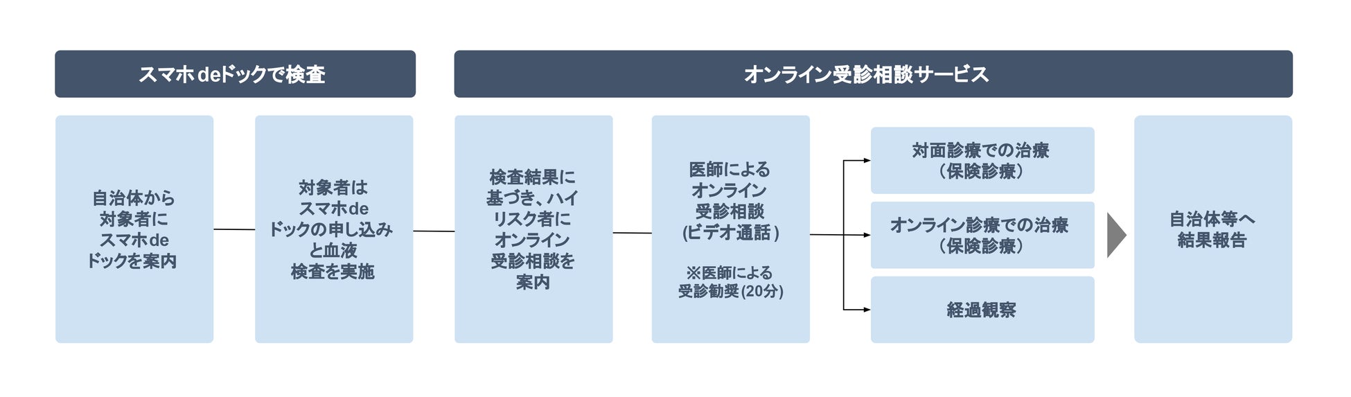 本サービスでは、「スマホdeドック」を使った血液検査で有所見となった方々へのフォローアップとして、オンラインで医師による受診相談を実施し、治療が必要な方に医療機関への受診勧奨を行います。