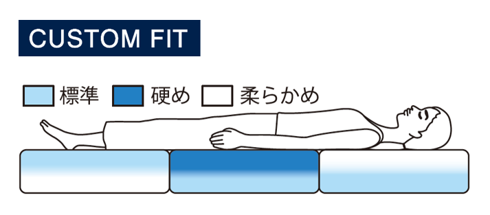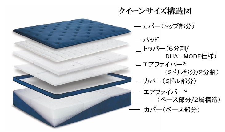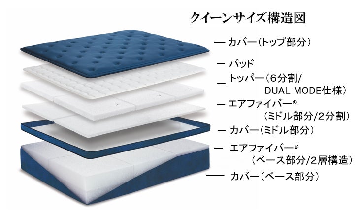 エアファイバー®は、トッパー部分とミドル部分、ベース部分の3層構造です。エアファイバー®のクッション性を見直し、トップ部分に、間隔をあけて縫うジャンプキルトを施すことでふわっと包み込まれるような感触を実現しました。トッパー部分とミドル部分を⼊れ替えることでお好みの寝心地に調整が可能です。