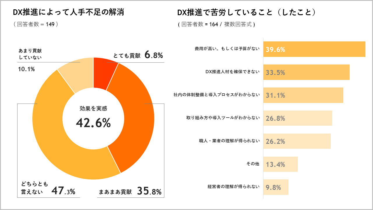 また、人手不足の解消に貢献しているかについても質問したところ、とても貢献している・まあまあ貢献している、を合わせると「人手不足の解消に貢献している」という意見が42.6%でした。「全く貢献していない」はゼロ回答でした。具体的な回答として、「DX推進によってテレワークがスタンダードになった」「1名で二人分の業務をこなせるようになった」「少ない人員数でありながら、DXで稼働率が上がり130%の売上成長を実現している」などの回答も得られました。