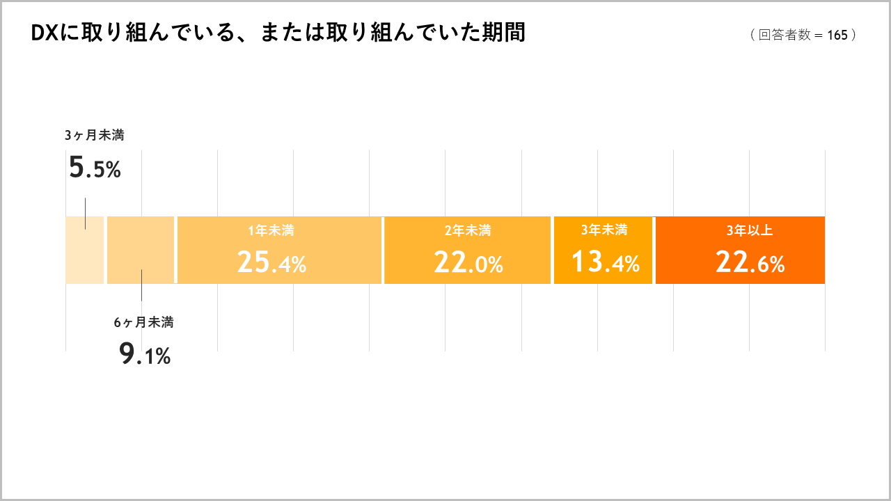 「DXに取り組んでいる(いた)」と回答した方に対して「DXに取り組んでいる(いた)期間をお教えください」という質問に対し、25.4%が「1年未満」と回答しました。「3ヶ月未満」「6ヶ月未満」含む直近1年以内でDXの取り組みを開始した企業は40.0%で、大きく増加したことがわかります。