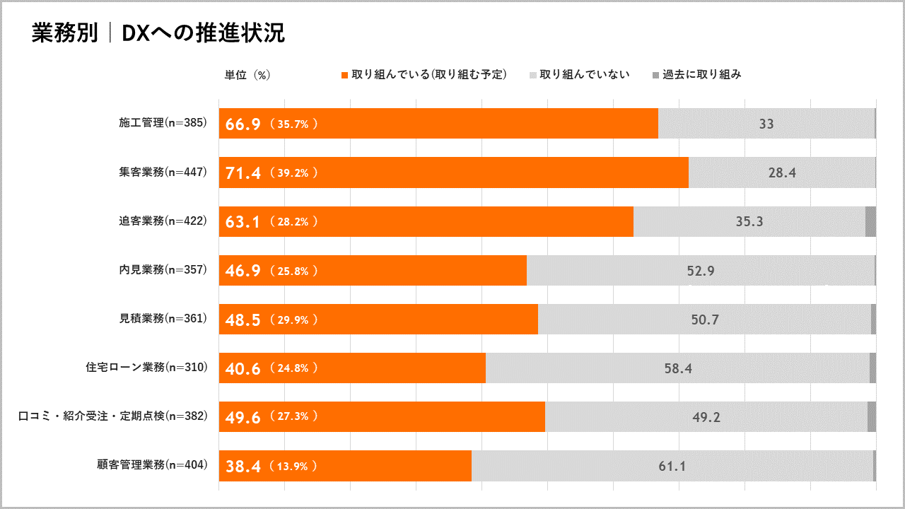 具体的な業務別のDXへの推進状況は「集客業務」が最多で71.4%、次いで「施工管理」が66.9%