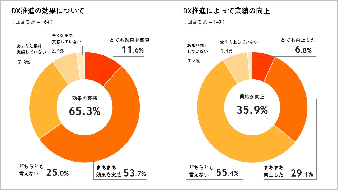 DXの効果について質問したところ、とても効果を実感している・まあまあ効果を実感している、をあわせると「効果を実感している」という回答が65.3%でした。同時に、DX推進によって業績が向上したかについても質問したところ、とても向上した・まあまあ向上した、を合わせると「業績が向上した」という回答は35.9%になりました。