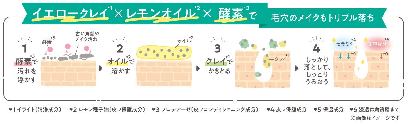 ●イエロークレイ*8×レモンオイル*9×酵素*10で毛穴のメイクもトリプル落ち