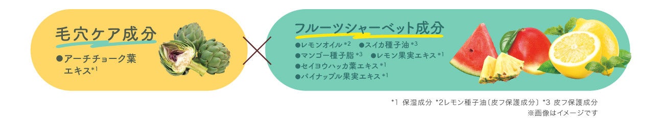 毛穴悩みをケアする成分と、紫外線などによる夏のダメージ肌にうるおいを与えるフルーツシャーベット成分を配合。