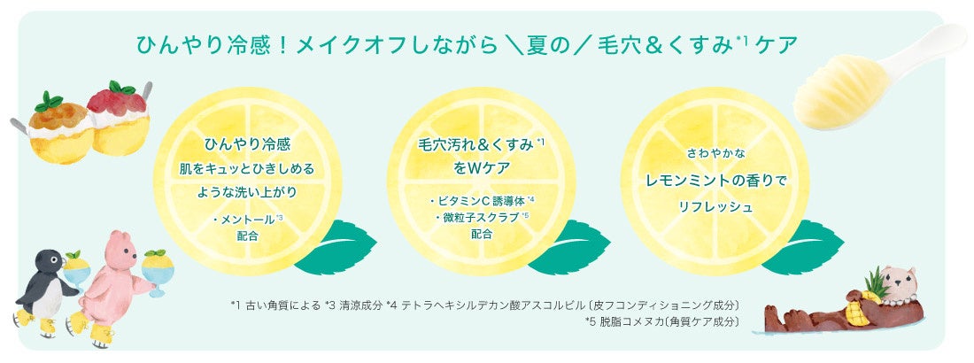 ひんやり冷たい感触で肌をクールダウンしながら毛穴・くすみ*1ケアができる1品5役の冷感クレンジングバーム。肌の上でとろけるなめらかな使い心地で、夏のウォータープルーフメイクもするっとオフ。毛穴汚れや古い角質まですっきり落として、しっとりさらさら毛穴レス*6肌に洗い上げます。