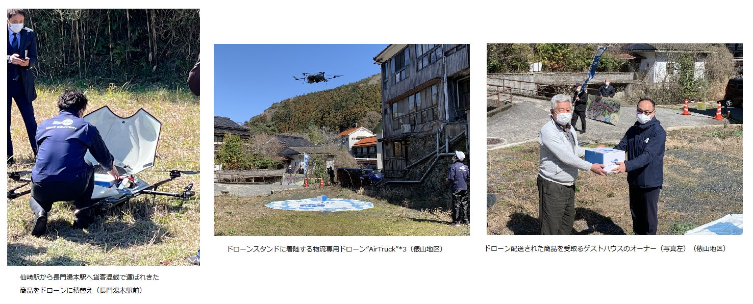 本実証では、物流事業者などの事業環境が大きく変わる中で、物を運ぶだけでなく、買い物難民の解消や公共交通の維持など地域課題解決を図ることができるように、物流網の再構築を目指します。今回は「貨客混載」をテーマとして、仙崎駅から長門湯本駅まではJR美祢線を利用し、JR仙崎線・長門湯本駅前から俵山温泉までドローンを利用して配送を実施いたしました。今回のドローン配送の実証はエアロネクストが開発をした物流専用ドローンAirTruck*3を用いています。機体の制御には、KDDIスマートドローンが開発したモバイル通信を用いて機体の遠隔制御・自律飛行を可能とするスマートドローンツールズ*5の運航管理システムを活用しました。