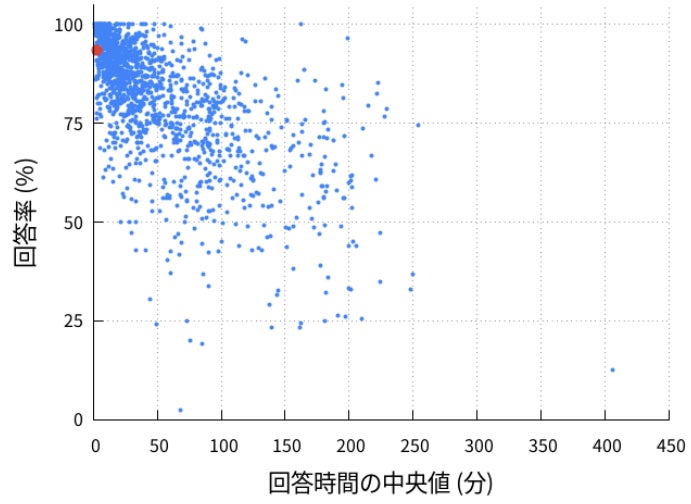 横軸が各社の回答時間の中央値、縦軸が各社の回答率である散布図です。回答率は一斉訓練開始から12時間後時点での回答率を示しています。なお、一斉訓練参加団体に提供しているレポートでは、団体ごとの結果を赤点で表示しております。上図はトヨクモの結果です。