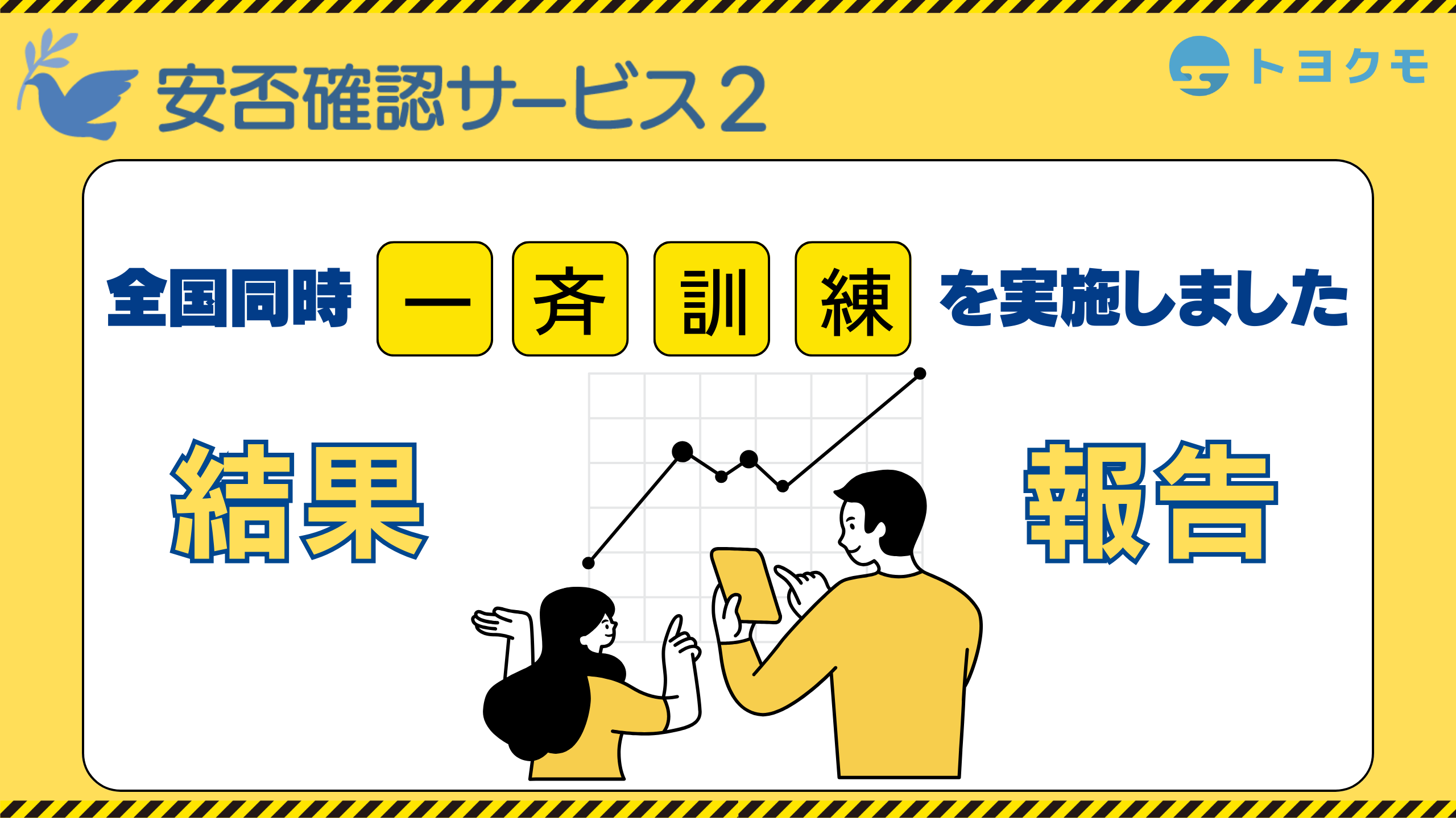 トヨクモは安否確認システムで唯一、継続的にユーザー参加型の一斉訓練を行なっています。一斉訓練では、参加ユーザーごとに回答率・回答時間を全体平均と比較したレポートを提供するため、防災力のチェックが可能です。また、メーカー側としても、システムに最大限負荷をかけることで、災害時にシステムを停止させることなく安定して稼働させられることを確認しております。