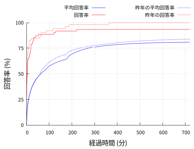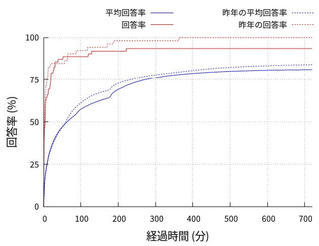 一斉訓練参加団体に提供しているレポートでは、団体ごとの結果を赤線で表示しており、全団体の平均を示す青線と比較していただけます。上図はトヨクモの結果です。今年度は昨年の回答率推移と比較していただけるようになりました。