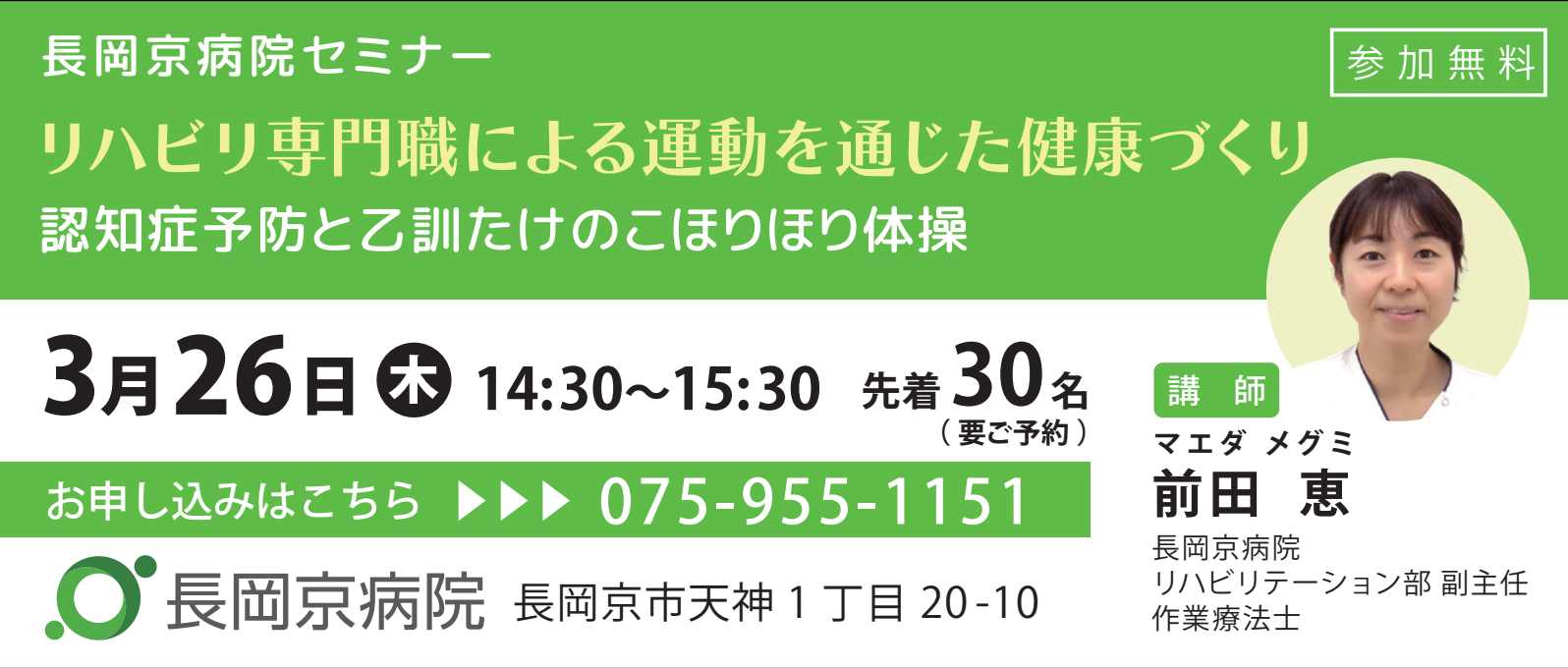 株式会社セントラルメディエンス(本社:東京都港区、代表取締役:中川隆太郎、以下「当社」)の提携医療機関である、医療法人総心会 長岡京病院 (所在地:京都府長岡京市、理事長:水黒知行、以下「当院」)は、3月26日(木)に運動に関するセミナーを開催することをお知らせいたします。