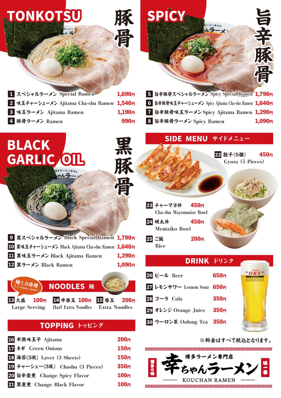 博多ラーメン専⾨店 幸ちゃんラーメン(こうちゃん)は、本場博多はもとより国内外11カ国で愛されている元祖泡系豚⾻ラーメン『博多⼀幸舎』がプロデュースする、豚⾻ラーメンブランドです。2025年3⽉現在、国内に19店、海外2店舗を展開し、看板商品の「博多豚⾻ラーメン」は、試⾏錯誤の後、しっかりと豚⾻の旨味(パンチ)と、ほんのり感じる⽢みがクセになるスープが特徴の豚⾻ラーメンとして完成しました。そして、麺は幸ちゃんラーメンの為だけに特別配合したこだわりの⼩⻨粉を使用。幸ちゃんラーメンオリジナルの豚⾻スープに合うよう、特注の細麺を使⽤しています。⼩⻨本来の⾹りが豊かに広がり、もっちり感と、しなやかなコシを楽しめ、パツッとした⾷感がついつい替⽟を注⽂したくなるほどクセになります。こだわりの、しっとりとした特製⼤判チャーシュー、シャキシャキの⻘ネギと⾷べ進めていただくことで、本場博多の町豚⾻を感じていただけます。そんな幸ちゃんラーメンは、お⼦様からご年配の⽅、⽼若男⼥問わず幅広い⽅達より「早い、美味い、また来たい!」本場博多の町豚⾻として⽀持いただいてます。