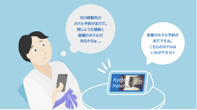 そこでTradFitは、宿泊ゲストが移動先で宿泊施設が決まっていない場合に、現在宿泊している客室に設置したAIスピーカーから、宿泊ゲストに最適な移動先の宿泊施設をレコメンドする基本特許技術「移動先宿泊施設レコメンド」によって、この問題を解決します。