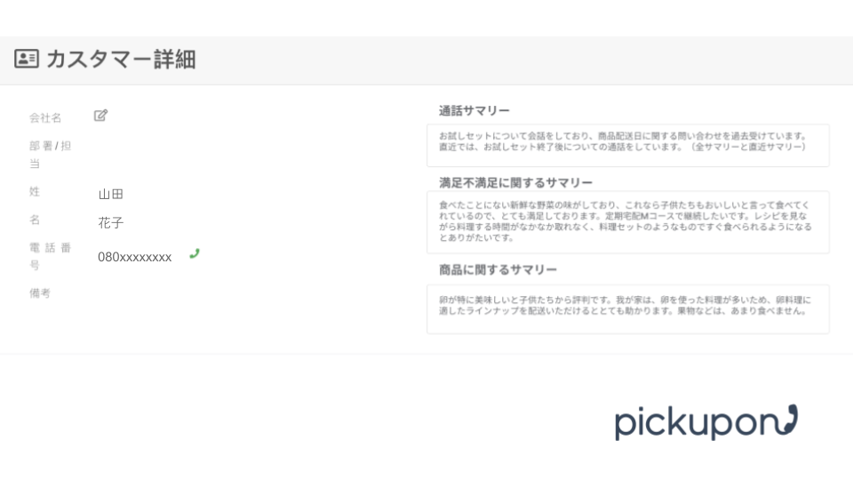 「pickupon(ピクポン)」は生成AIを活用し、顧客理解や顧客分析をサポートするAI電話です。顧客ごとに架電内容のサマリーを自動で作成・社内展開する機能に加え、社内プロンプトエンジニアリングチームの伴走により、過去架電データのストックから目的に応じた情報を抽出することが可能です。