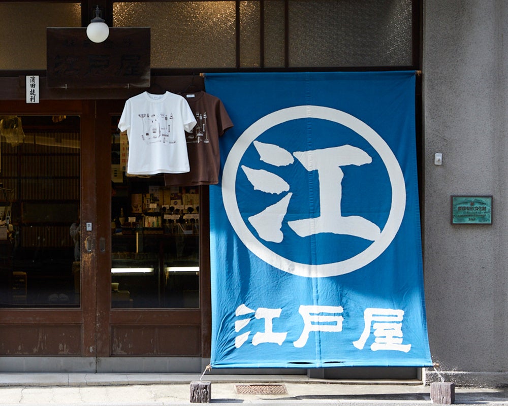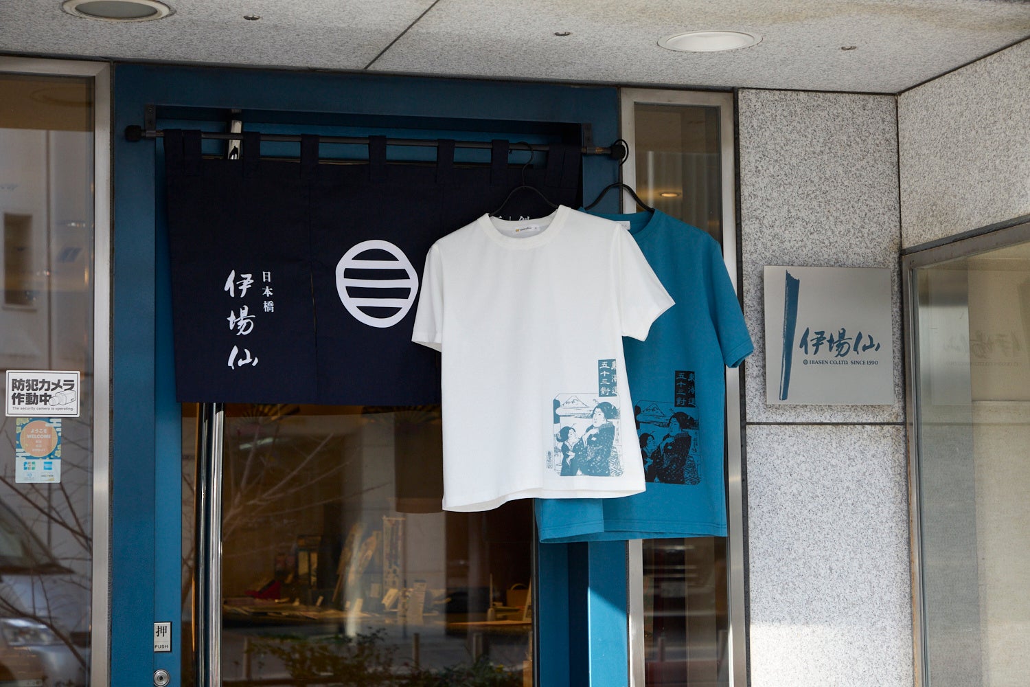 Tシャツには歌川国芳が描いた、東海道五十三對の「日本橋」をプリントしました。看板にリンクしたカラーにもご注目ください。