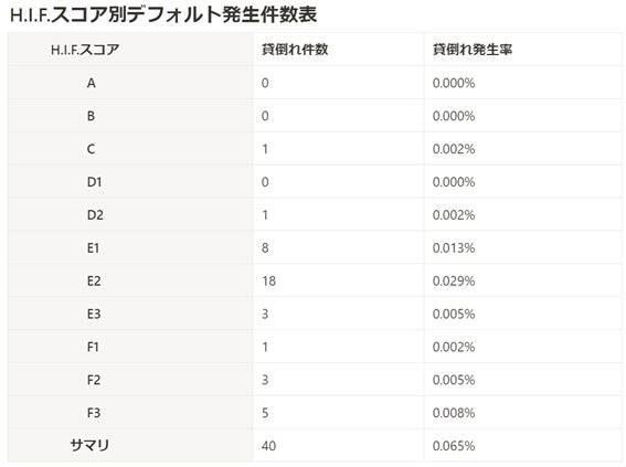 本技術の活用により、業界平均デフォルト率1.08%に対し、H.I.F.は1/18の0.06%と、圧倒的に低いデフォルト率を実現しています。