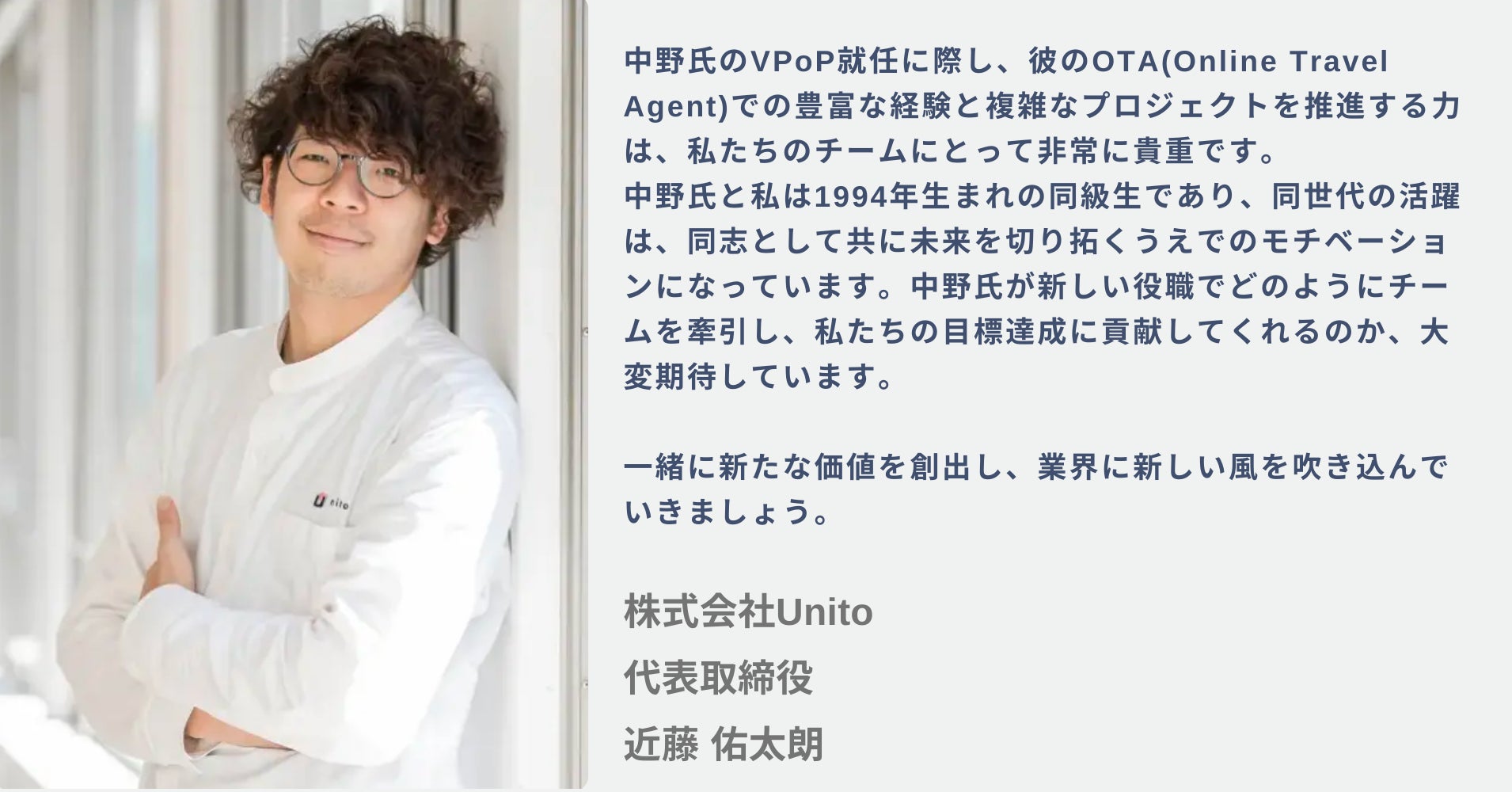 帰らない日は家賃がかからない住まい「unito(ユニット)」を提供する株式会社Unito(東京都千代田区、代表取締役:近藤佑太朗、以下Unito)は、VPoP(※プロダクトの最高責任者 「Vice President of Product」の略)に中野 創太が就任したことをお知らせいたします。