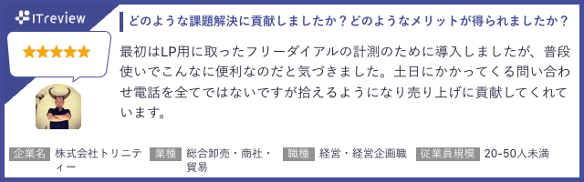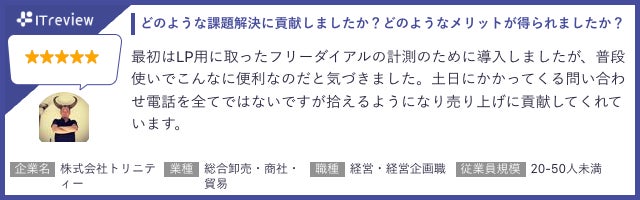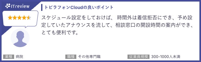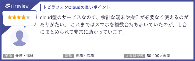 「トビラフォン Cloud」は「ITreview」で平均顧客満足度4.2を獲得しています(2024年1月18日時点)。当製品のご利用者様から実際に寄せられたレビューを一部ご紹介します。