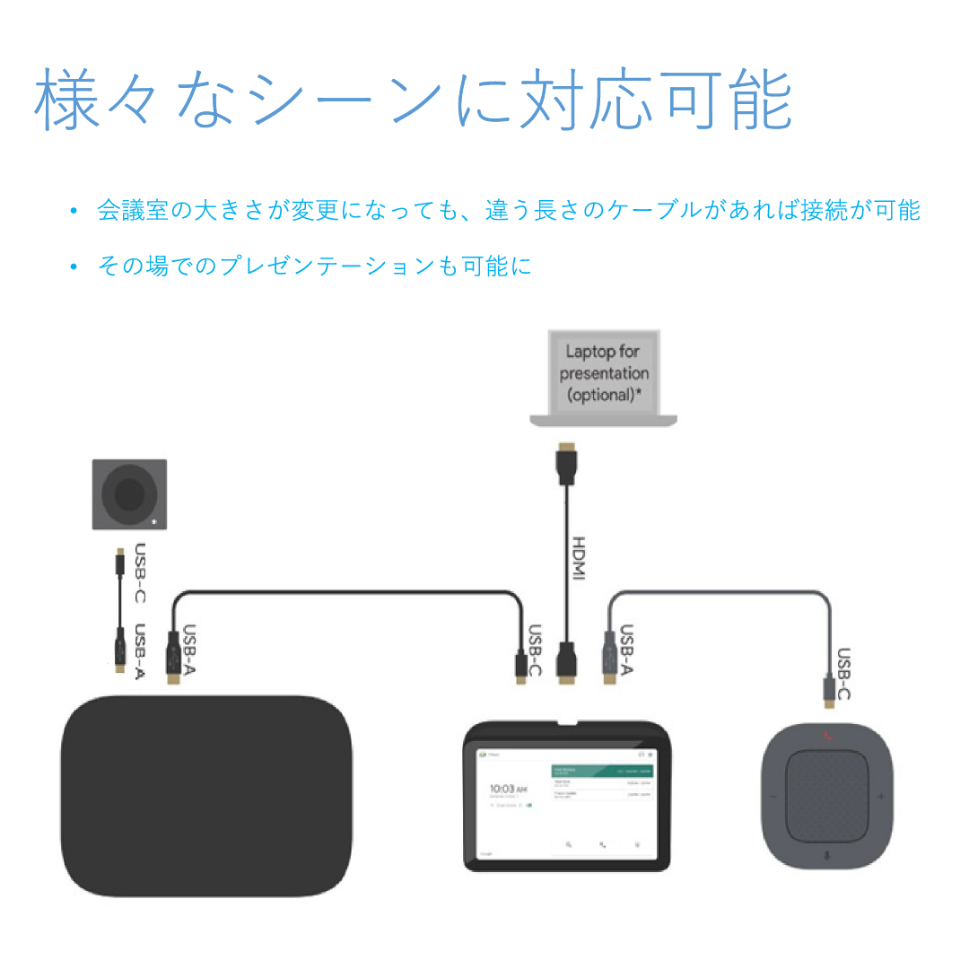 昨今のテレワーク/ハイブリッドワーク普及の流れを受け、多くの組織ではオンライン会議システムの頻度が増し、即座にどこでも会議を開けるようなソリューションが期待されています。具体的には、オフィス内の様々な部屋への持ち運びができる、よりコンパクトなサイズ感のツールで、会議をすぐに行える点が要件として挙げられることが増えています。