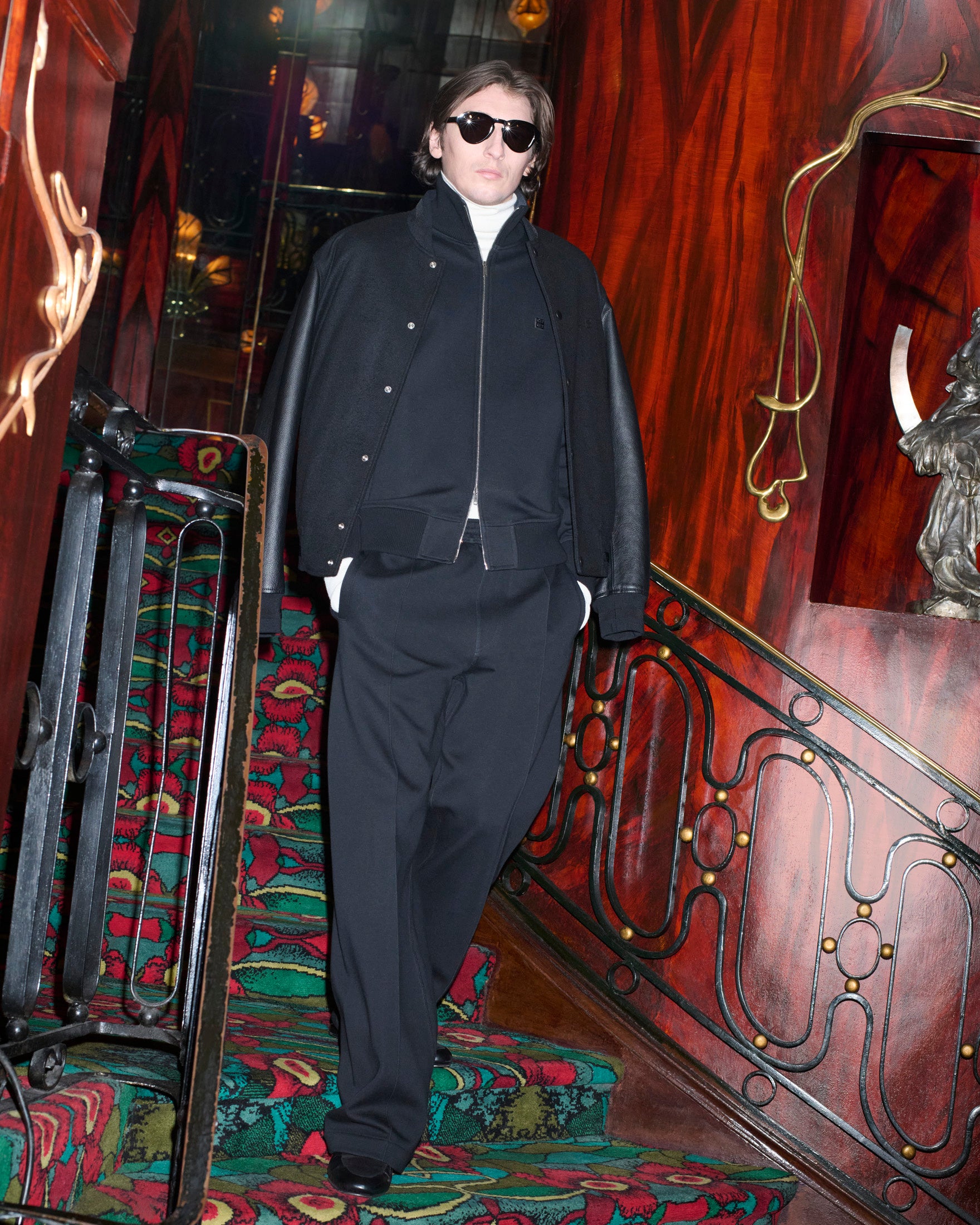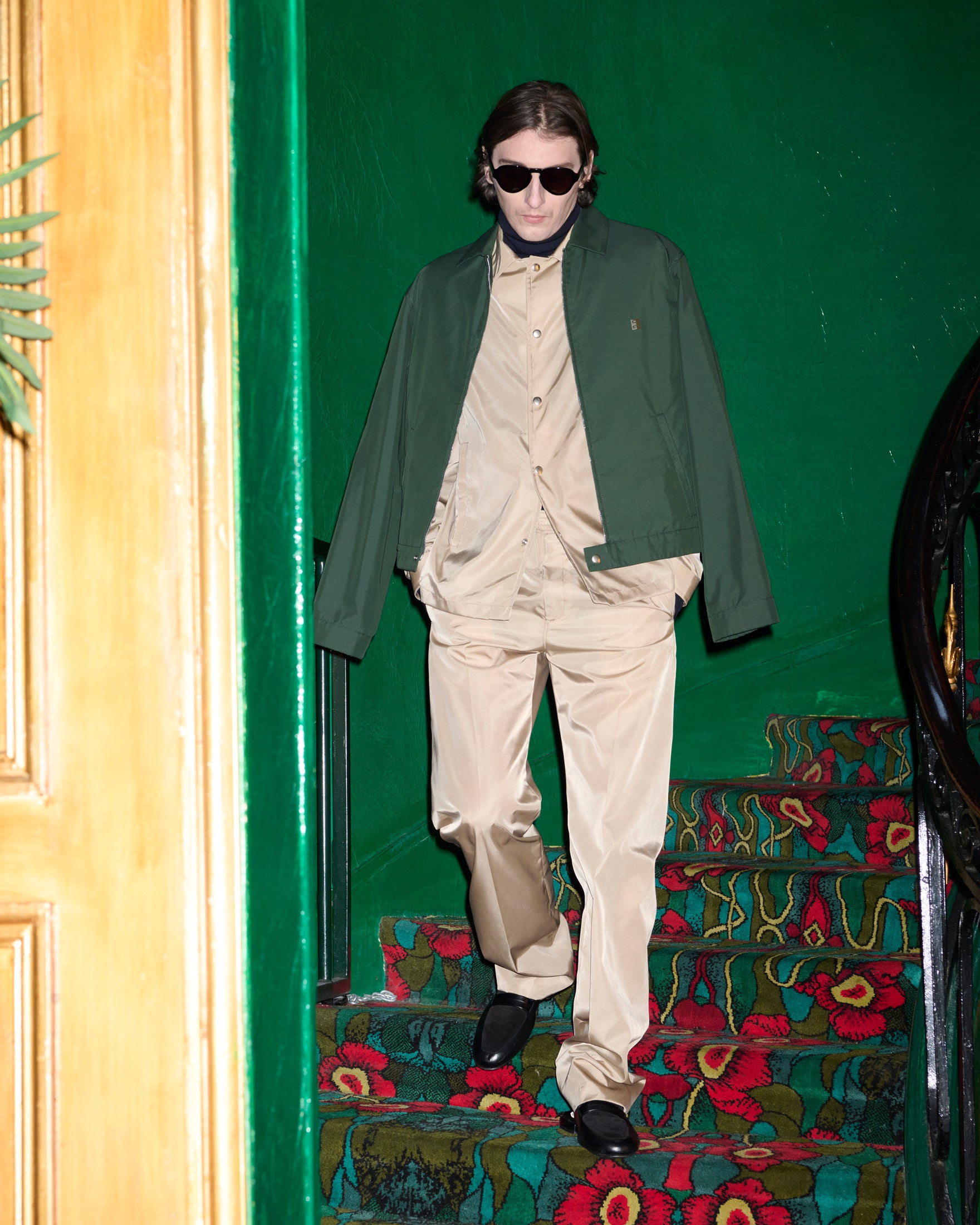 ノンシャランなエレガンスが特徴のこのコレクションは、流れるようなスーツやリラックス感のあるストレートパンツに、ボタンダウンシャツやゆとりのあるジャカードニットを同系色で合わせるスタイリングが中心です。一方、流行に左右されないブラックのユーティリティジャケットや、バーシティにインスパイアされたアウターウェアのような時代を超えて愛される定番アイテムは、コレクションにノスタルジーをほのかに漂わせ、全体の美学にさらなる深みを与えています。