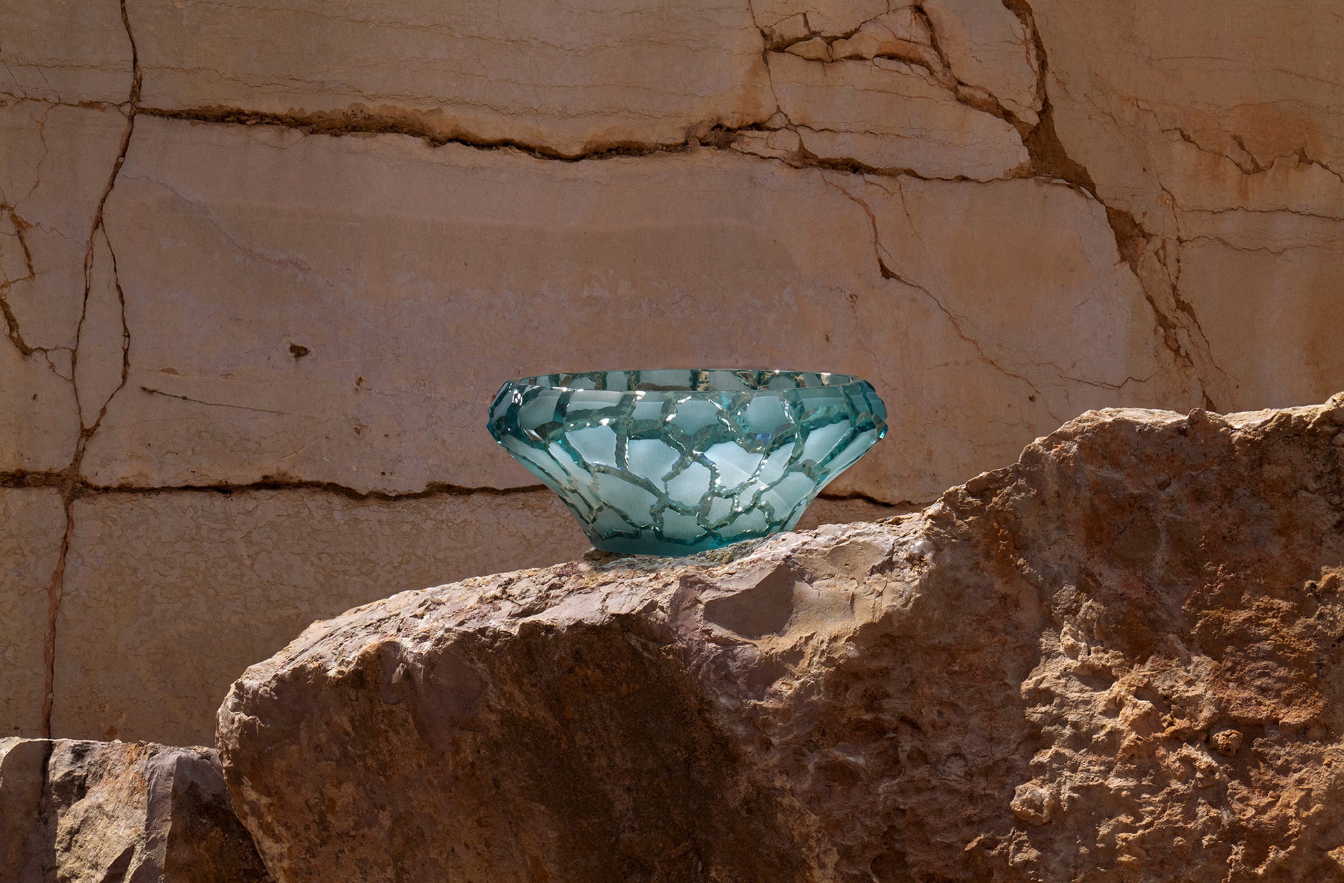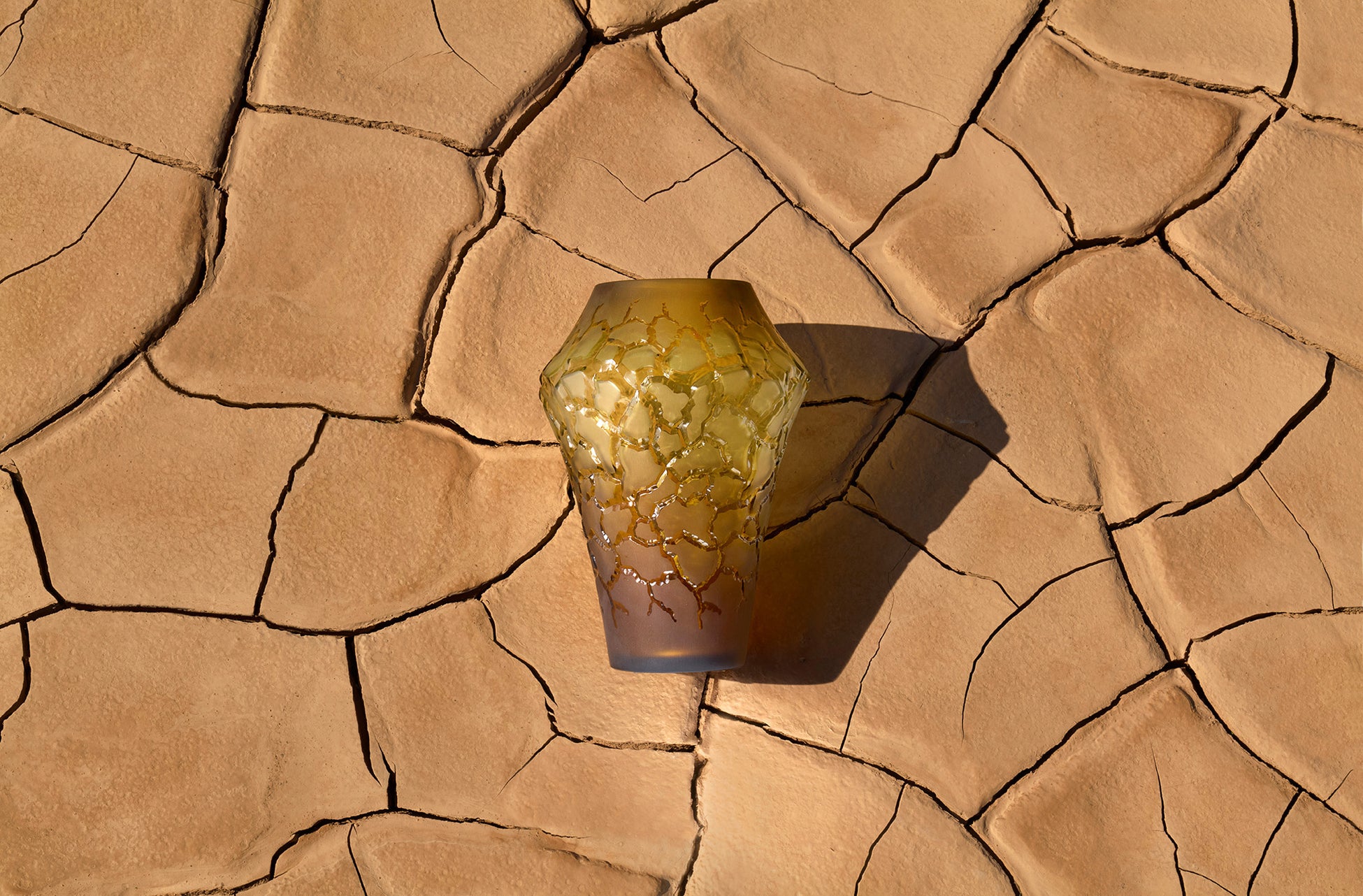 ラリックはこのコレクションで地球の大地の雄大さをクリスタルの重厚さで捉え、そこに繊細なレリーフと光を彫刻することで、矛盾しつつ調和する自然の美とともにクリスタルという素材の力強さと儚さを引き出しました。